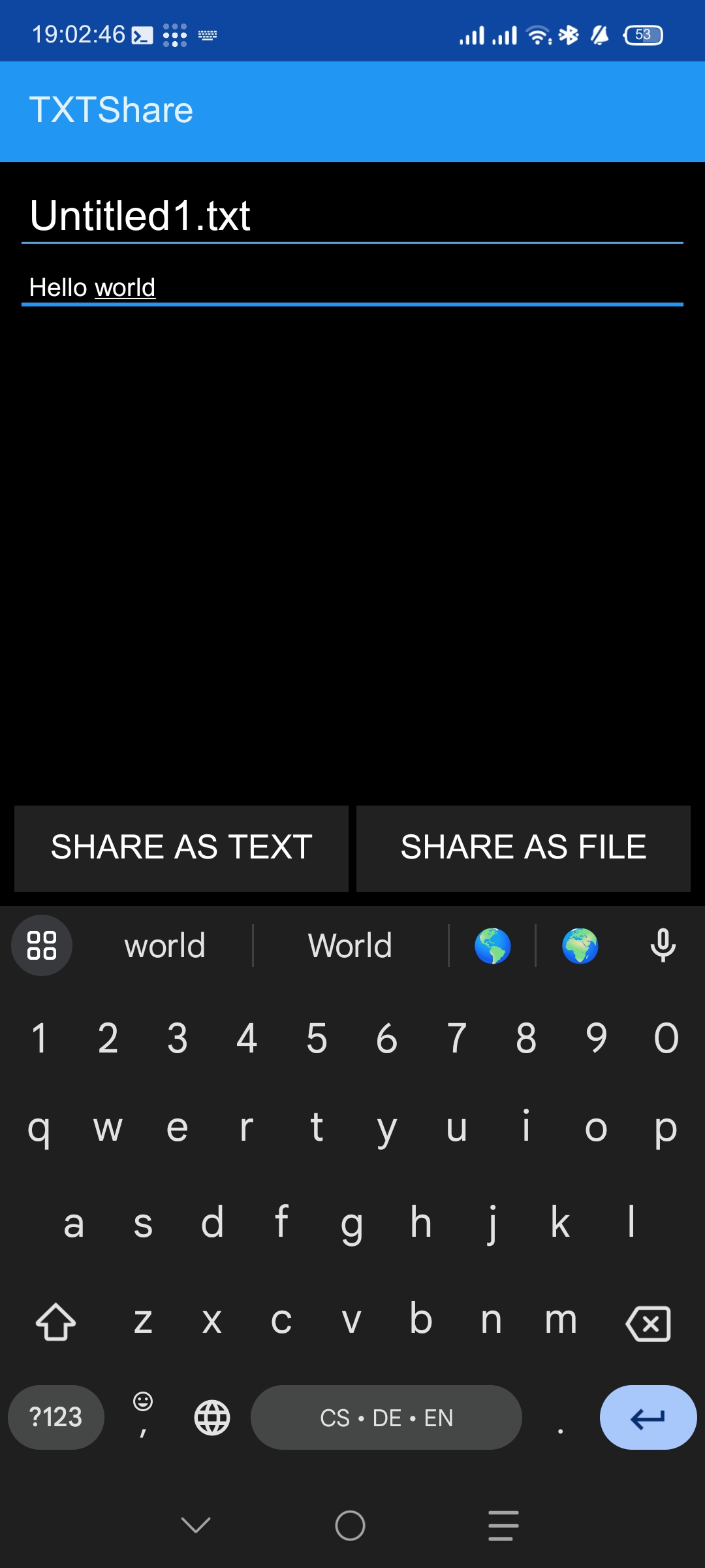 this app creates a temporary text file in its own data directory with the content you provide in the app, sharing the file on button press